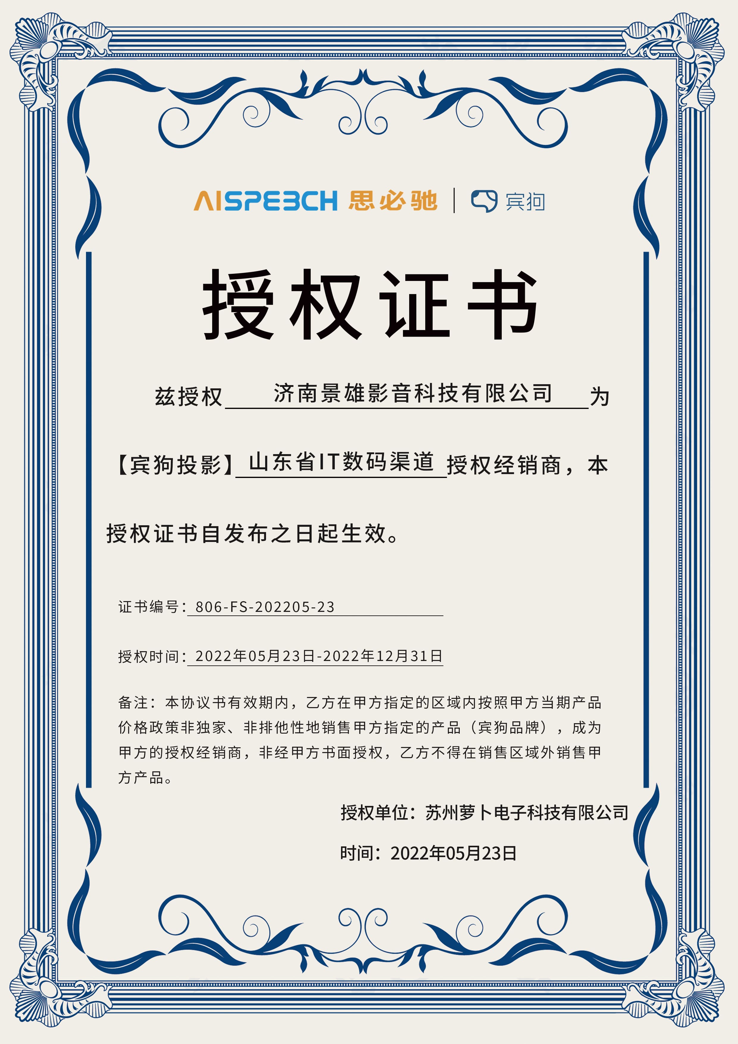 賓狗授權(quán)證書(shū)