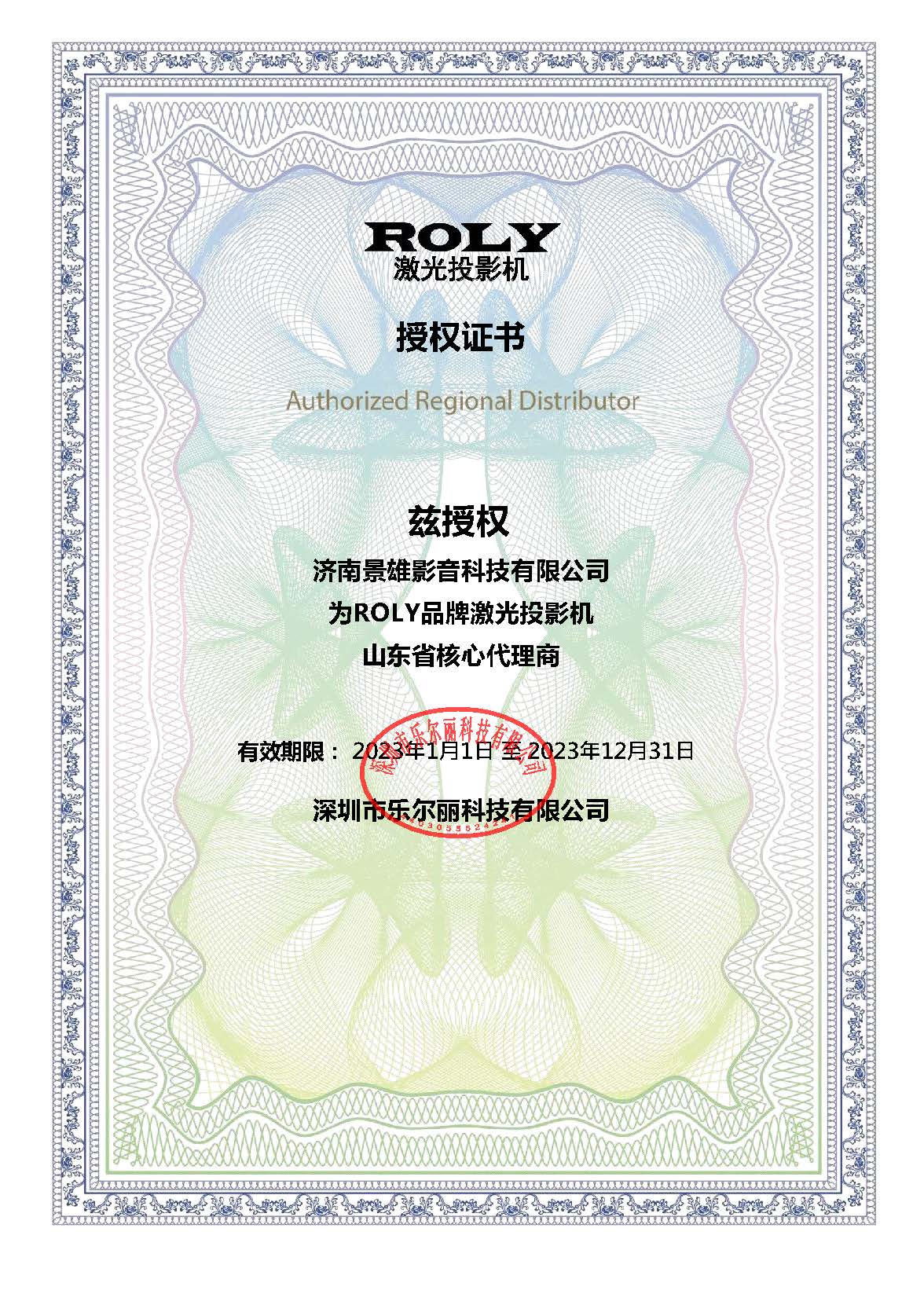 樂(lè)麗授權(quán)證書(shū)